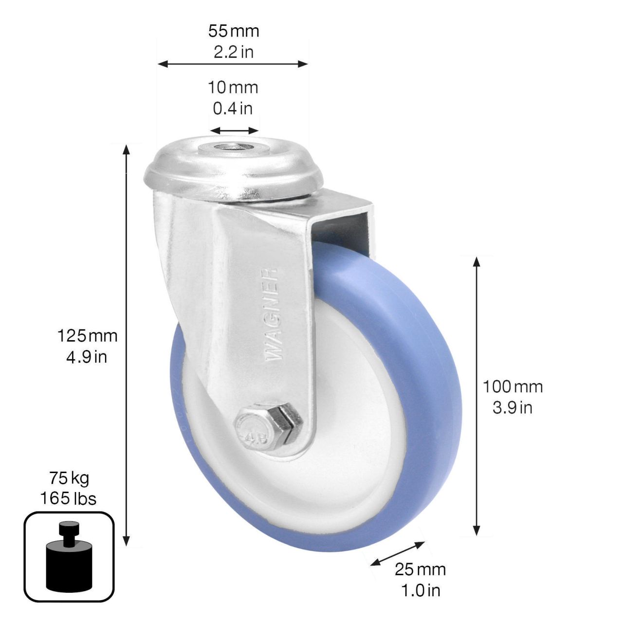 - Raddurchmesser Ø 100 mm, Radbreite 25 mm, Bauhöhe 125 mm, Kranz Ø 55 mm, Rückenloch Ø 10 mm, Tragkraft 75 kg
