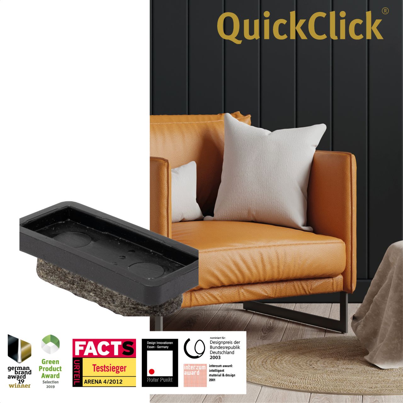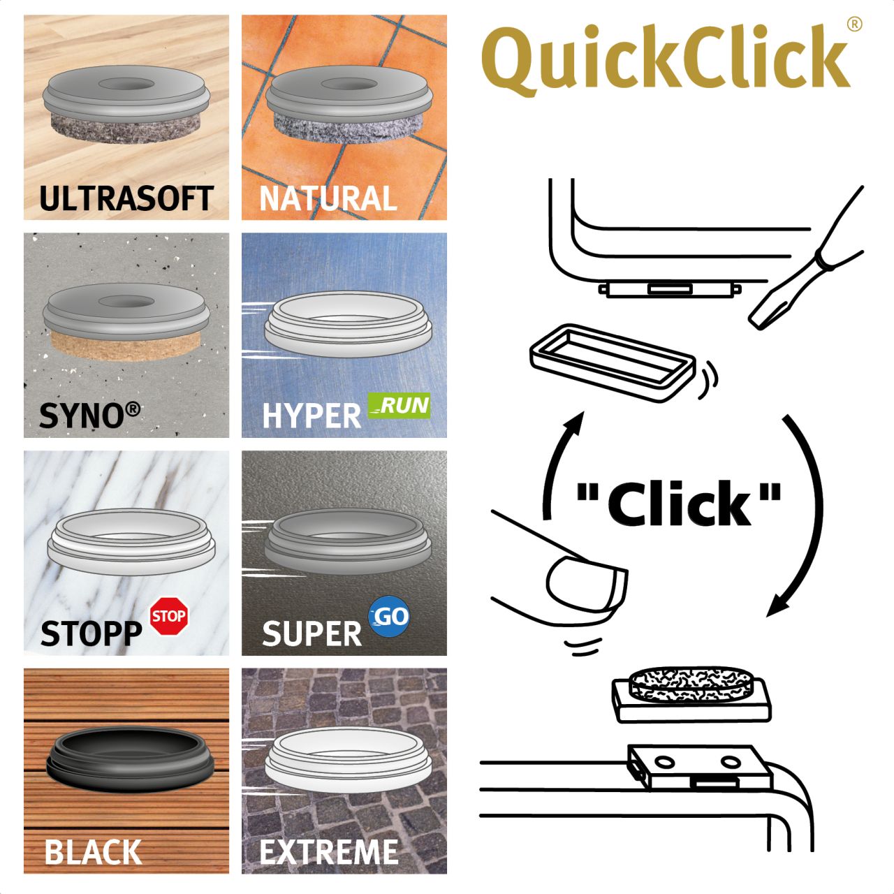Die intelligente Lösung: QuickClick - das erste Gleit- und Stopp-System mit austauschbaren Einsätzen und Aufsätzen! Dieses System ist so einfach wie genial. Das Clevere daran: Ein Basisteil aus hochwertigem Kunststoff wird 1x am Möbel befestigt und dient als Aufnahme für verschiedene Gleit- und Stopp Einsätze und Aufsätze. Diese können nach Bedarf ausgewählt, eingeklickt oder aufgeklickt und jederzeit ohne spezielles Werkzeug ausgetauscht werden. Das schützt Möbel und Böden - dauerhaft!