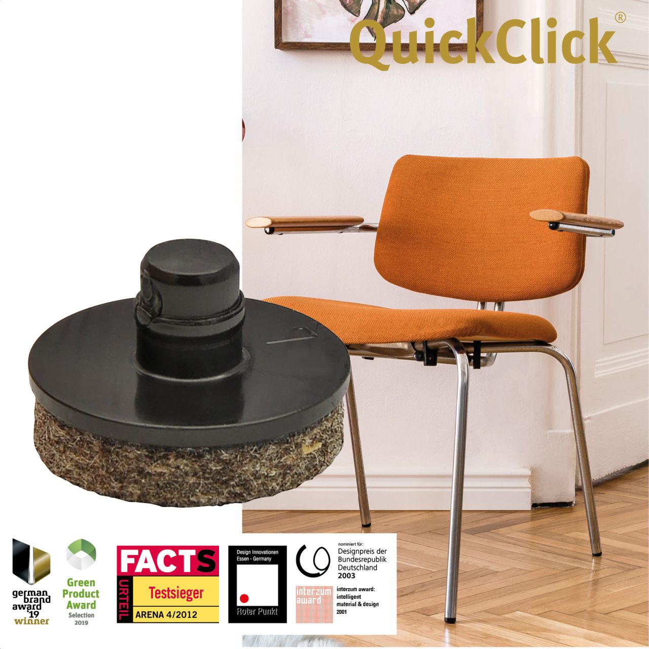 Die intelligente Lösung: QuickClick - das erste Gleit- und Stopp-System mit austauschbaren Einsätzen und Aufsätzen! Dieses System ist so einfach wie genial. Das Clevere daran: Ein Basisteil aus hochwertigem Kunststoff wird 1 x am Möbel befestigt und dient als Aufnahme für verschiedene Gleit- und Stopp-Einsätze. Diese können nach Bedarf ausgewählt, eingeklickt oder aufgeklickt und jederzeit ohne spezielles Werkzeug ausgetauscht werden. Das schützt Möbel und Böden - dauerhaft!