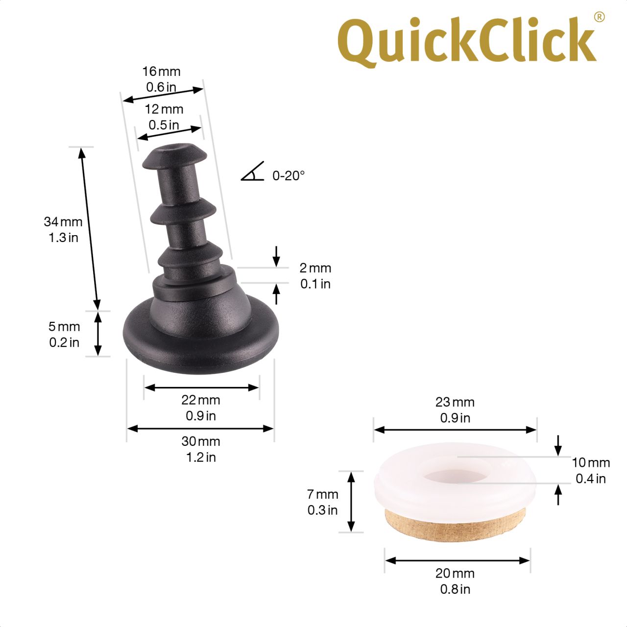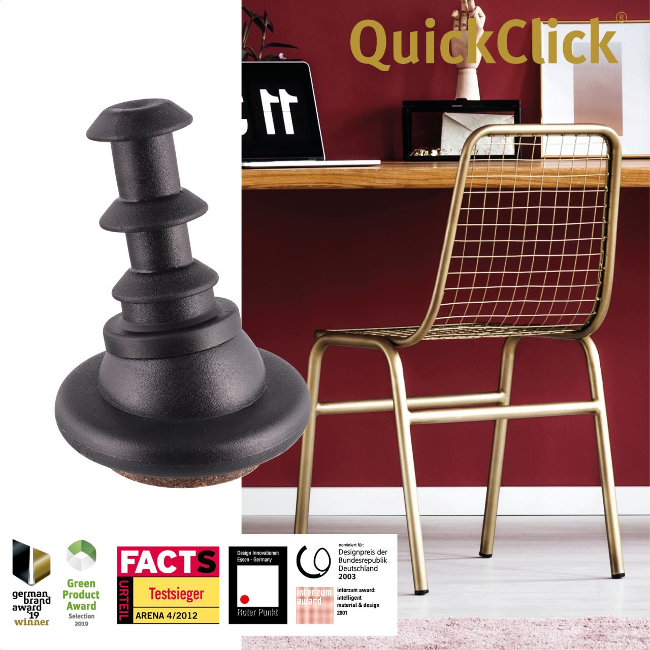 Die intelligente Lösung: QuickClick - das erste Gleit- und Stopp-System mit austauschbaren Einsätzen und Aufsätzen! Dieses System ist so einfach wie genial. Das Clevere daran: Ein Basisteil aus hochwertigem Kunststoff wird 1 x am Möbel befestigt und dient als Aufnahme für verschiedene Gleit- und Stopp-Einsätze. Diese können nach Bedarf ausgewählt, eingeklickt oder aufgeklickt und jederzeit ohne spezielles Werkzeug ausgetauscht werden. Das schützt Möbel und Böden - dauerhaft!
