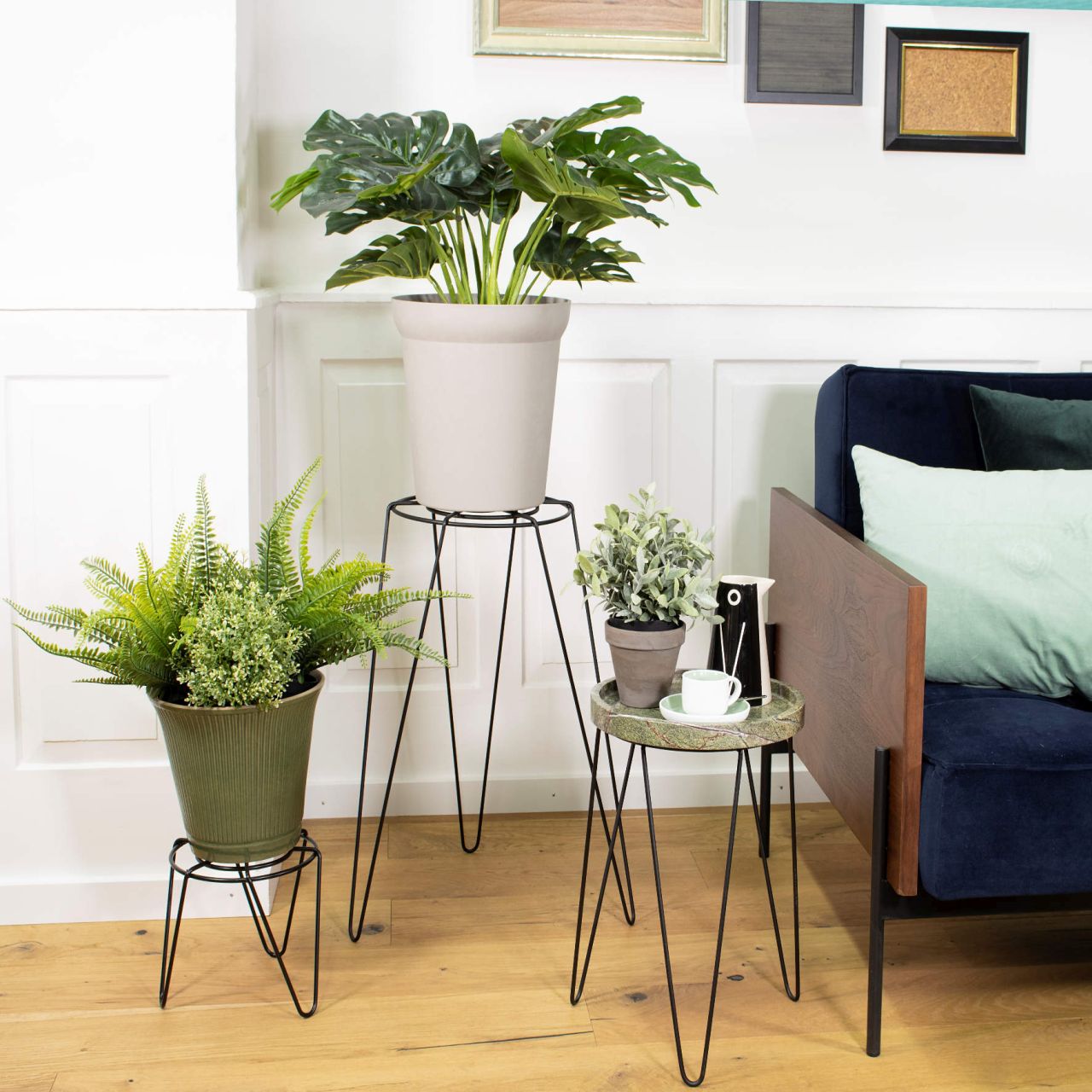 Der Pflanzenständer ist aus pulverbeschichtetem Stahl in der Trendfarbe "Schwarz matt" gefertigt.
