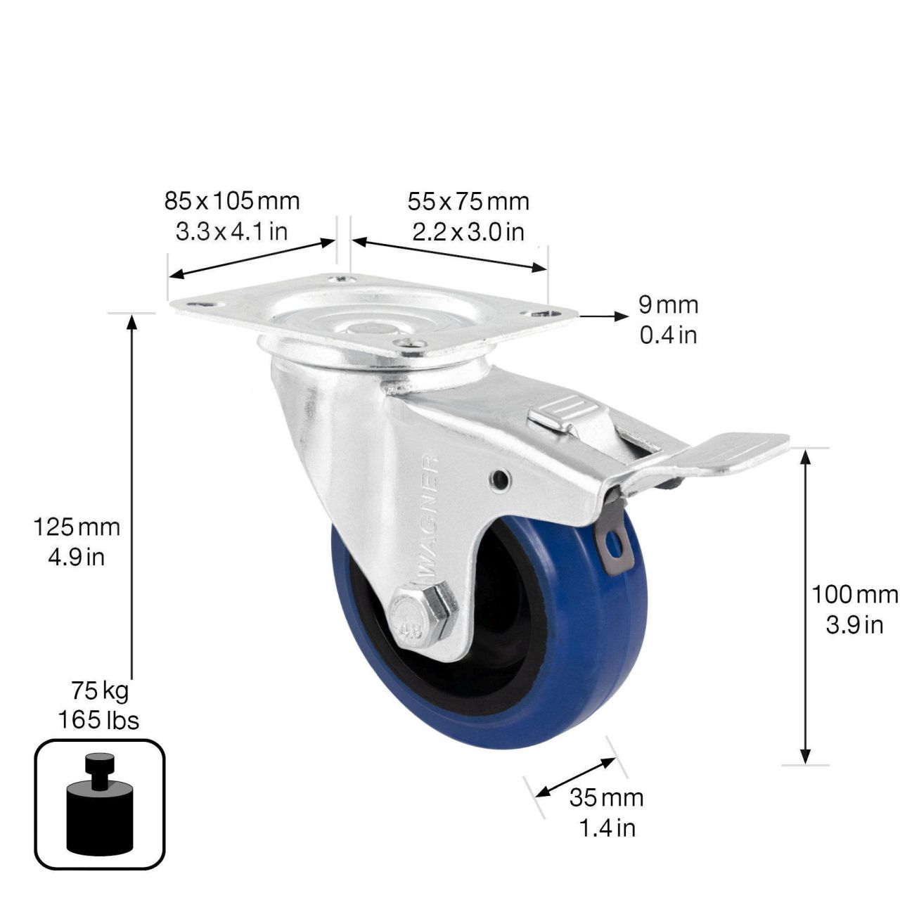 - Raddurchmesser Ø 100 mm, Radbreite 35 mm, Bauhöhe 125 mm, Anschraubplatte 85 x 105 mm, Tragkraft 75 kg