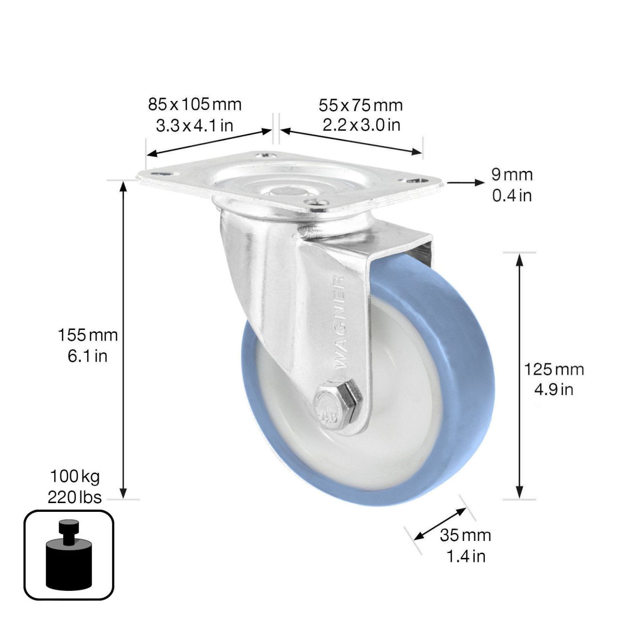 - Raddurchmesser Ø 125 mm, Radbreite 35 mm, Bauhöhe 155 mm, Anschraubplatte 85 x 105 mm, Tragkraft 100 kg