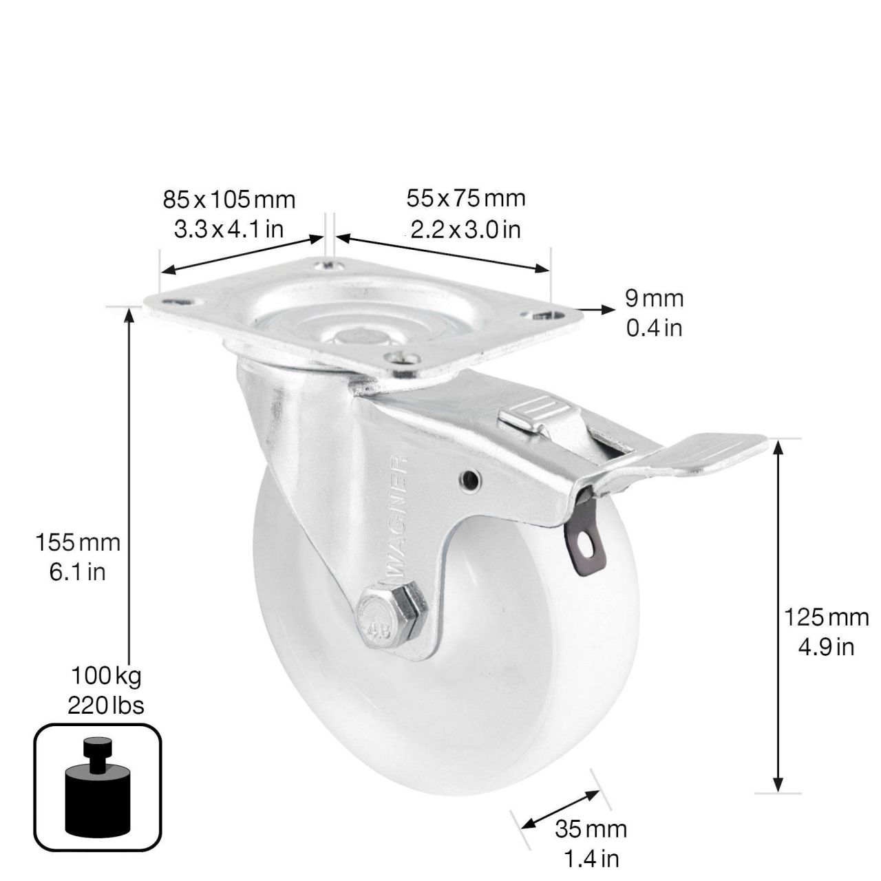 - Raddurchmesser Ø 125 mm, Radbreite 35 mm, Bauhöhe 155 mm, Anschraubplatte 85 x 105 mm, Tragkraft 100 kg
