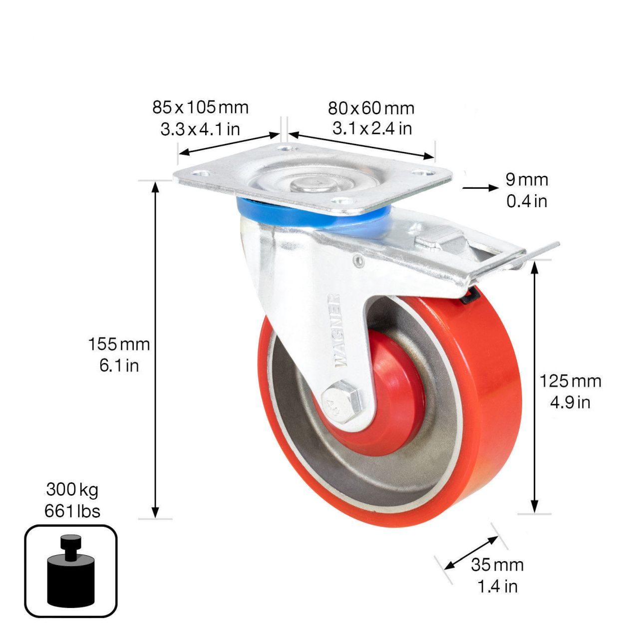 - Raddurchmesser Ø 125 mm, Radbreite 35 mm, Bauhöhe 155 mm, Anschraubplatte 85 x 105 mm, Tragkraft 300 kg