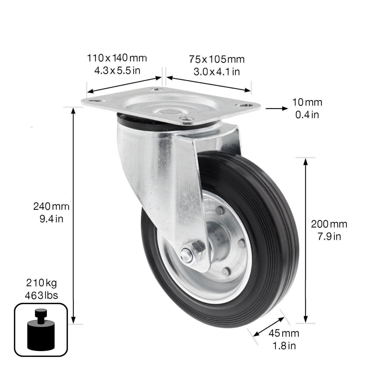 - Raddurchmesser Ø 200 mm, Radbreite 45 mm, Bauhöhe 240 mm, Anschraubplatte 110 x 140 mm, Tragkraft 210 kg