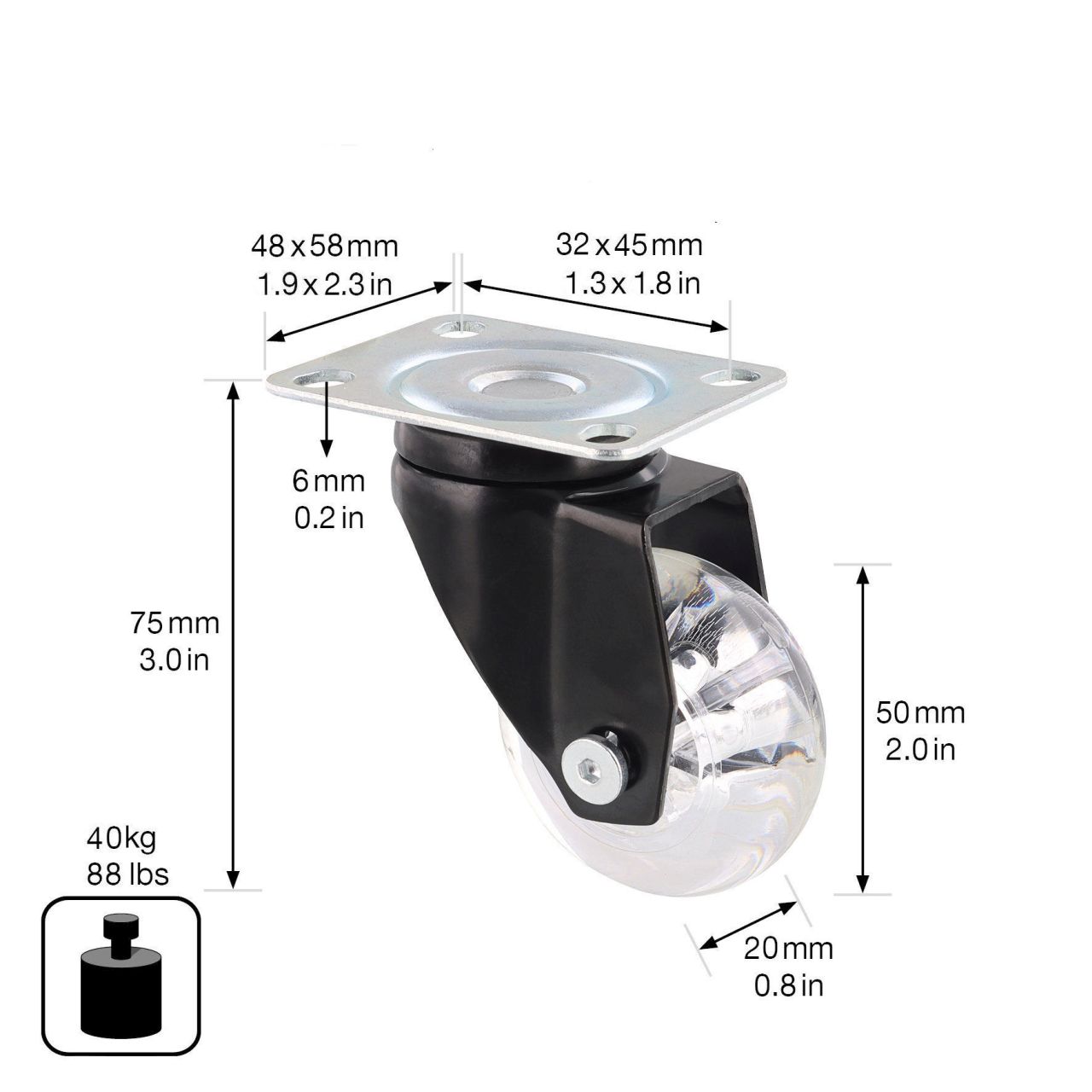 - Raddurchmesser Ø 50 mm, Radbreite 20 mm, Bauhöhe 75 mm, Anschraubplatte 48 x 58 mm, Tragkraft 40 kg