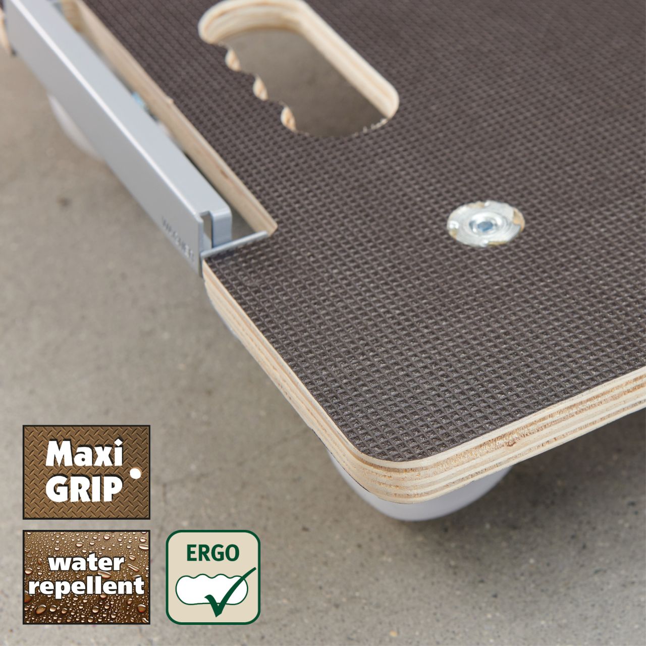 - Ladefläche aus äußerst formstabiler Multiplexplatte 18 mm aus nachhaltiger Forstwirtschaft, mit rutschfester MaxiGRIP-Spezialbeschichtung, (Anti-Rutsch Filmsiebdruck), braun